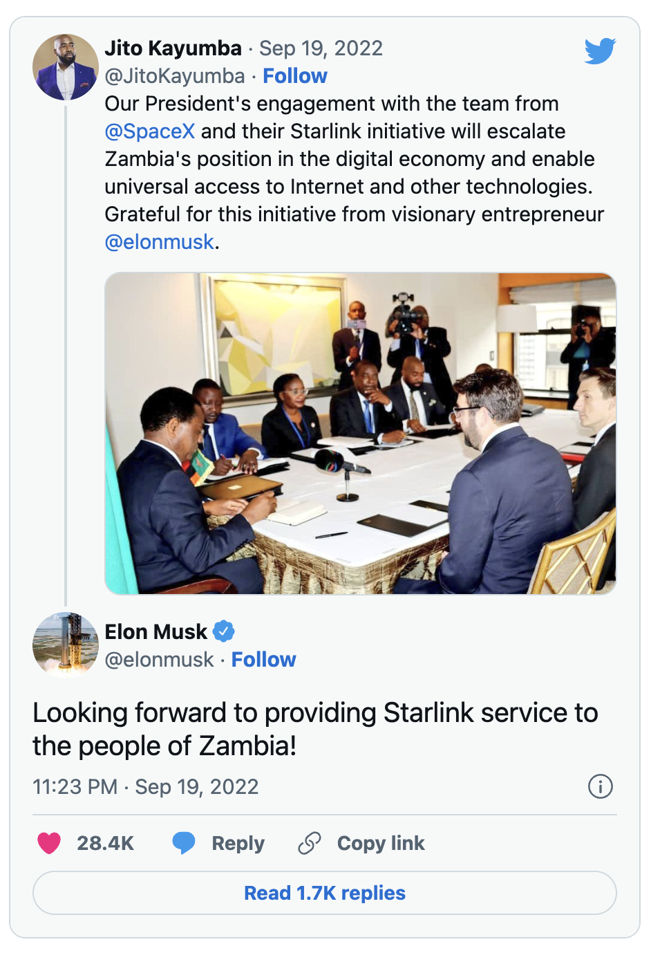 Recently, Jito Kayumba—the Special Assistant to the Republic of Zambia—tweeted about SpaceX and the country’s officials meeting about Starlink services.