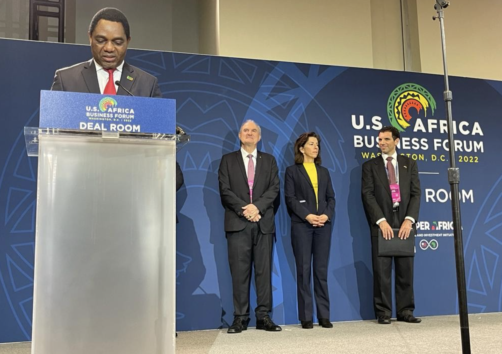 Hichilema speaks at the U.S. Africa Business Forum following the announcement of KoBold Metal’s historic investment. Image via Twitter (@usembassyzambia)